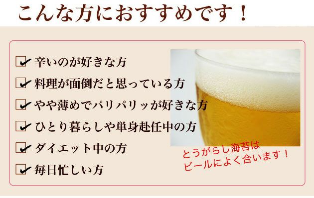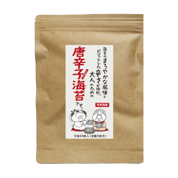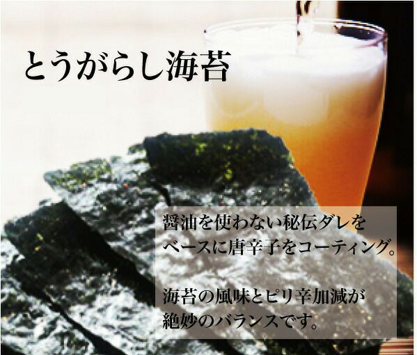 有明海産の高級海苔を醤油を使わずに秘伝のタレで仕込んだ味付け海苔です。秘伝のタレに唐辛子をブレンドし、ほんのりピリ辛味。