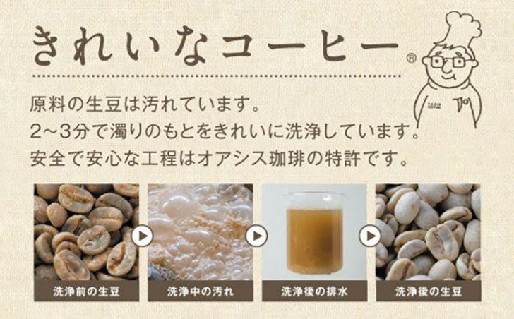 きれいなコーヒーとは、特許技術により、生豆に付着した果肉や不純物をジェット水流で短時間にきれいに洗浄してから焙煎する、クリアな味わいのコーヒーです。