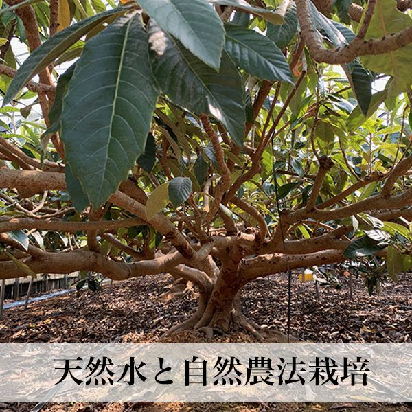 早苗さんのびわは、岡垣町の山あいから湧き出る天然水をくみ上げ、栽培期間中は農薬、化学肥料、除草剤を使用していません。