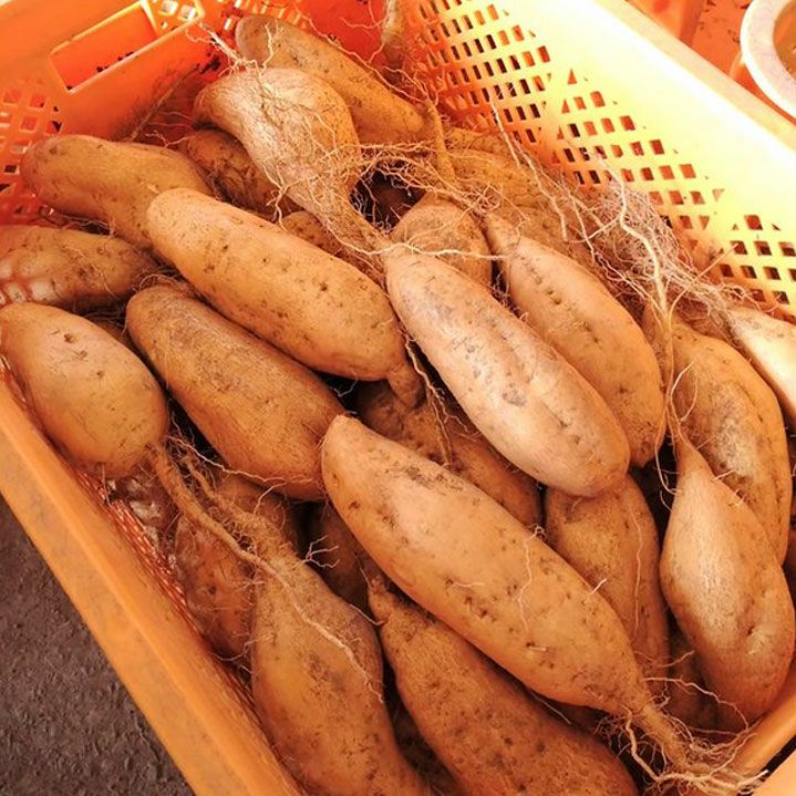 栗こがねは、ジャガイモのような皮色。火を通すことでしっとりとした食感になり、栗のような上品な甘さが特徴です。