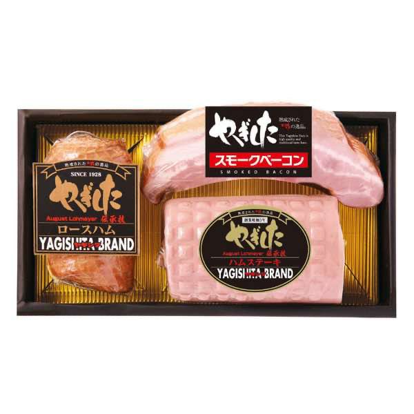 ヤギシタの独自製法を活かした、人気の高い原型ロースハムと、荒挽き加減が丁度良いハムステーキ、ベーコンブロックの3本を詰め合わせました。化粧箱入り。熨斗無料サービス。