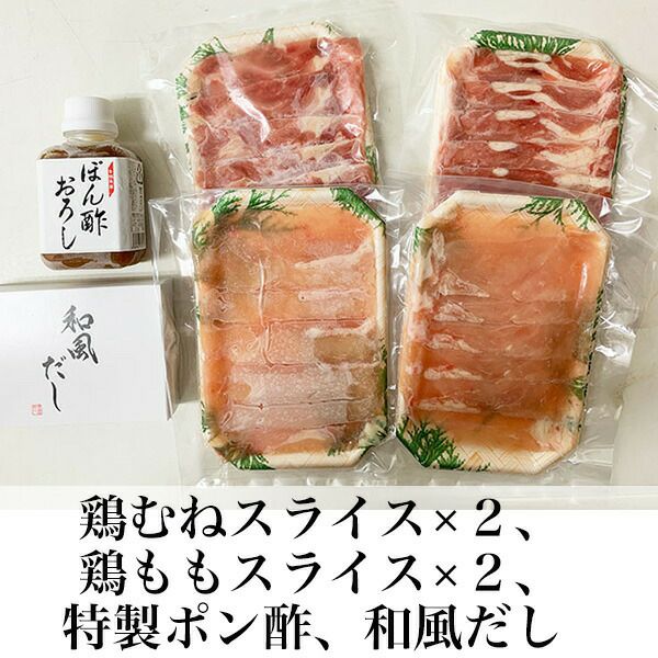 むね肉スライス(福岡産)100g×2、ももスライス(福岡産)100g×2、とりしゃぶ専用スープ100g、ポン酢1本 |