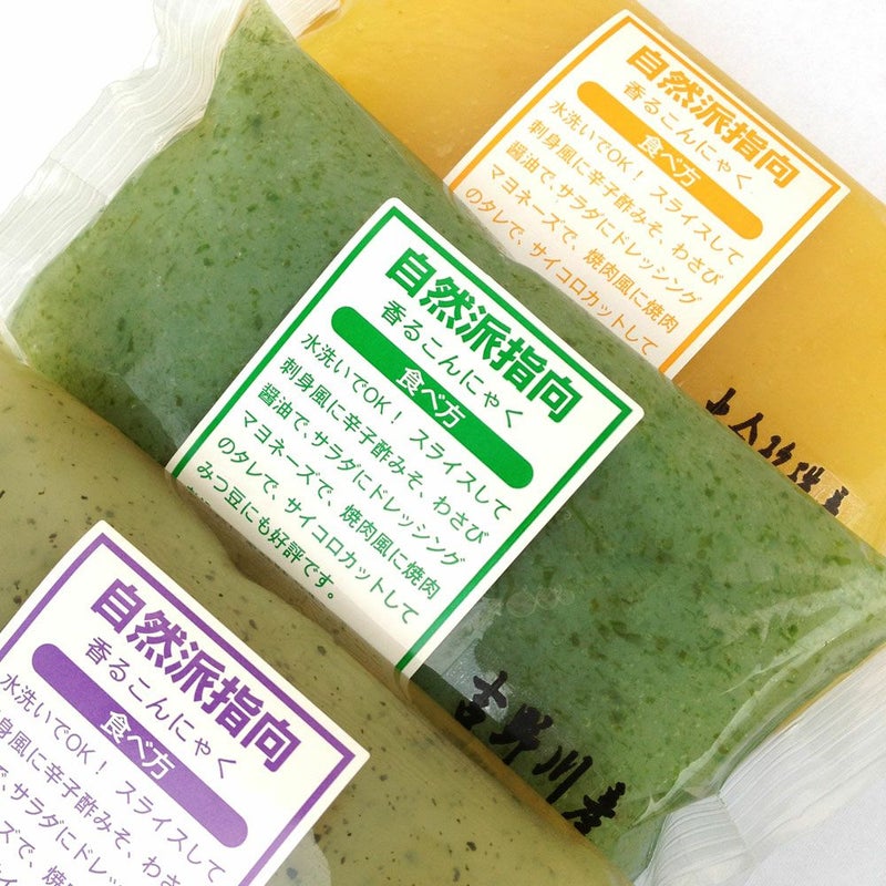 ・青のりこんにゃく: こんにゃく芋製粉(国内産)、 青のり(吉野川産)/貝殻焼成カルシウム