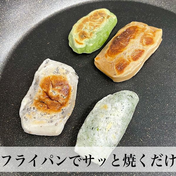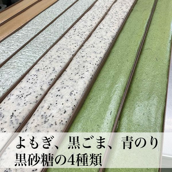 よもぎ、黒ごま、黒砂糖、青のりの4種類入り。