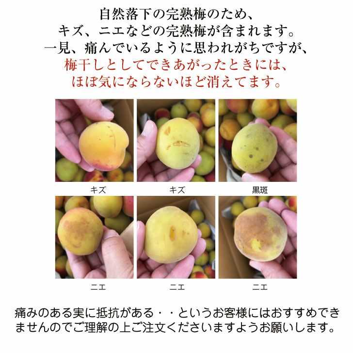 ・自然落下の梅です。お届け時に生じている痛みや擦り傷は、梅干しや梅酒として出来上がったときにはほとんど目立たなくなっています。それでも痛みのある実に抵抗がある・・というお客様にはお勧めできません。