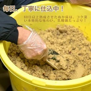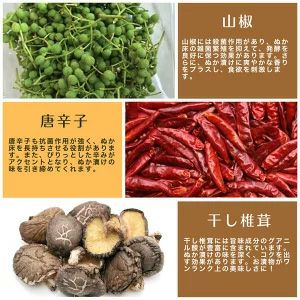 栽培期間中農薬不使用の米ぬか(あたか農園産) ・沖縄県産の天日塩 ・唐辛子、昆布、干し椎茸、かつおぶし、山椒など、すべて国産素材 60日以上熟成させたぬか床は、コク深い本格的な味わい。