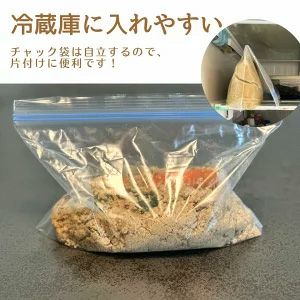 野菜を漬け込むと、袋の底が平べったくなり自立できます。冷蔵庫にちょこんと片づけれて場所をとりません。