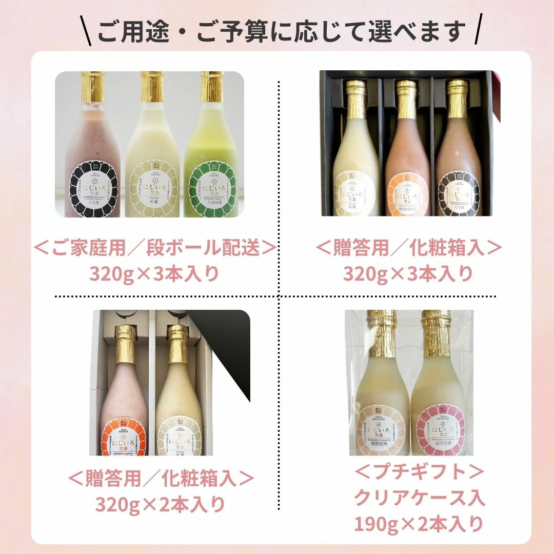 朝ごはん本舗では、「にじいろ甘酒」をお好みやシーンに合わせて選べるセットをご用意しています。