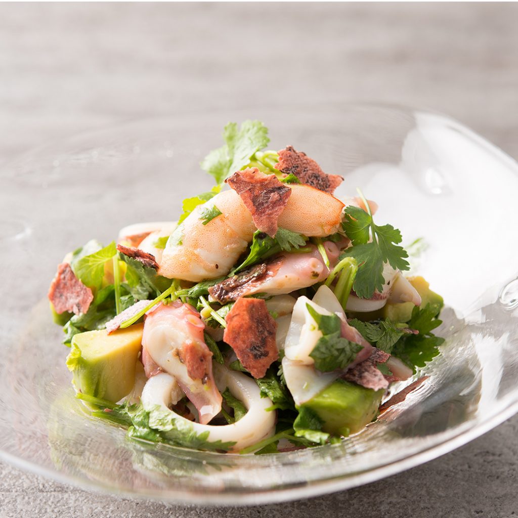 ●えび・いか・たこをアボカドと合わせ、パクチーと梅ナンプラーソースで